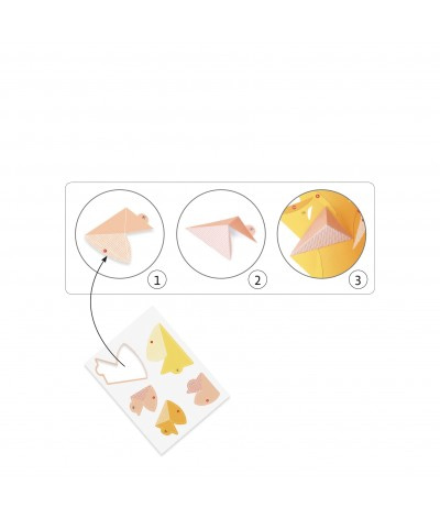 Inhoud: 1 basis van dik karton (39 x 45 cm) met inkepingen, 8 bedrukte vellen voorgesneden los te maken papieren vormen, 1 vel dubbelzijdig plakband, 1 stap-voor-stap instructieboekje in kleur.