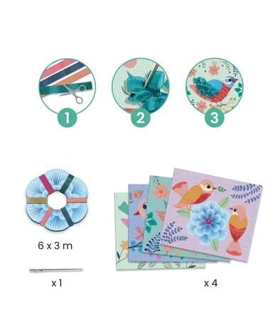 Met deze kit kunnen kinderen 4 kleurenplaten met satijnen linten en organza maken. Met de naald met ronde punt schuiven ze de linten in de geperforeerde kaarten en maken ze er kronkels, lussen en strikjes mee die de tekeningen reliëf en glans geven.