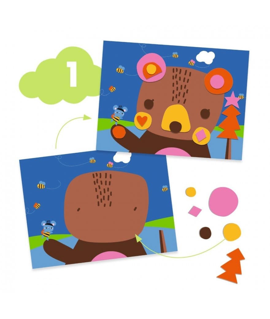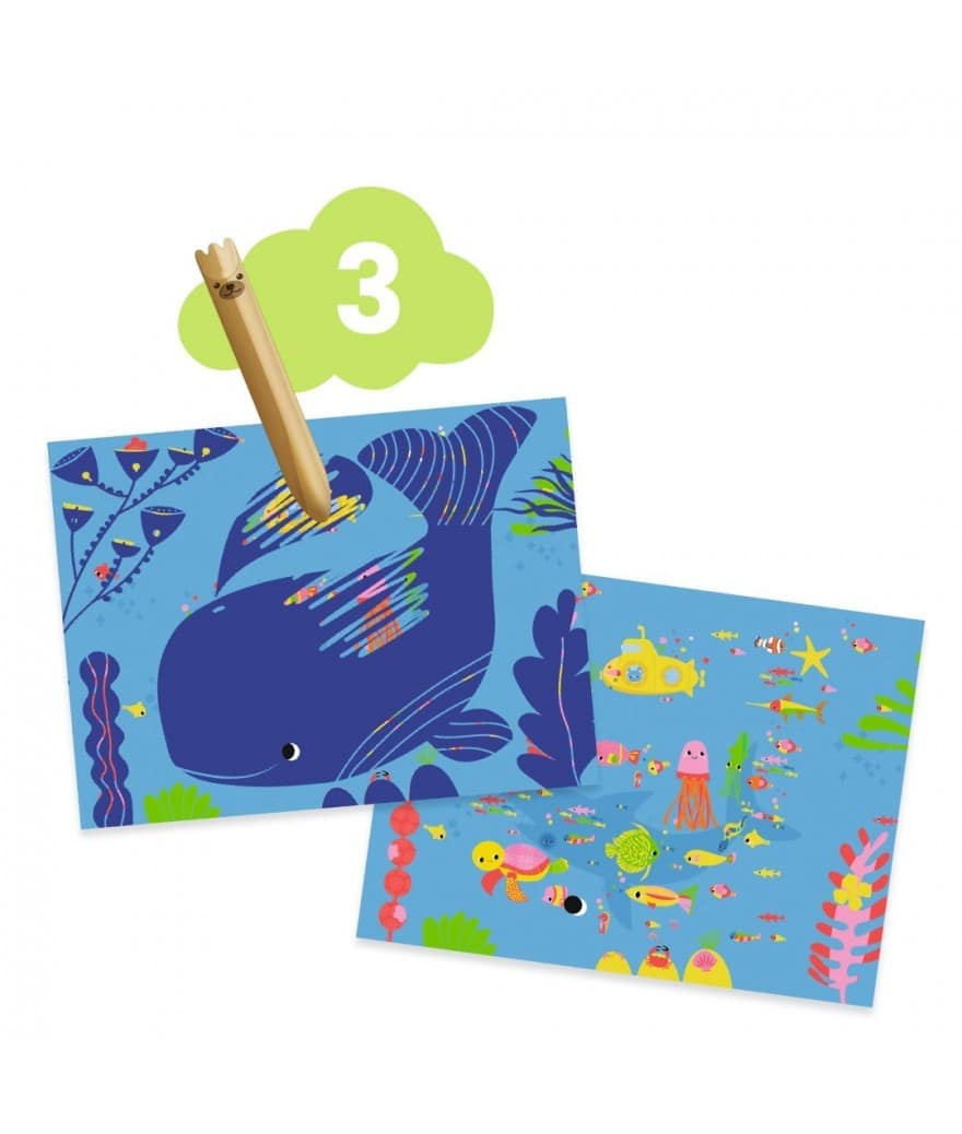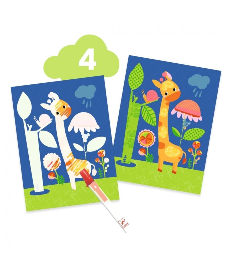 Inhoud: Plakken: 1 geïllustreerde kaart, 1 voorgesneden vel van dik karton, 1 tube lijm. Plakken met vilt: 2 vellen om te versieren, 4 vellen met zelfklevende stukjes vilt. Color stop: 4 geïllustreerde vellen, 1 sjabloon, 4 kleurpotloden. Kleuren met water: 1 kaart met een witte laag, 1 waterpen. Kleurplaten die tevoorschijn komen: 3 kleurkaarten met magische lak. Kraskaart: 3 kaarten en 1 houten hulpstuk. 1 boekje met stap-voor-stap uitleg.