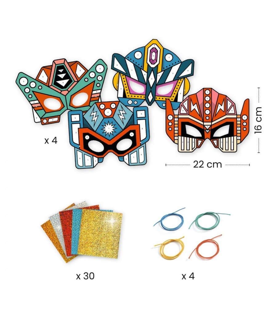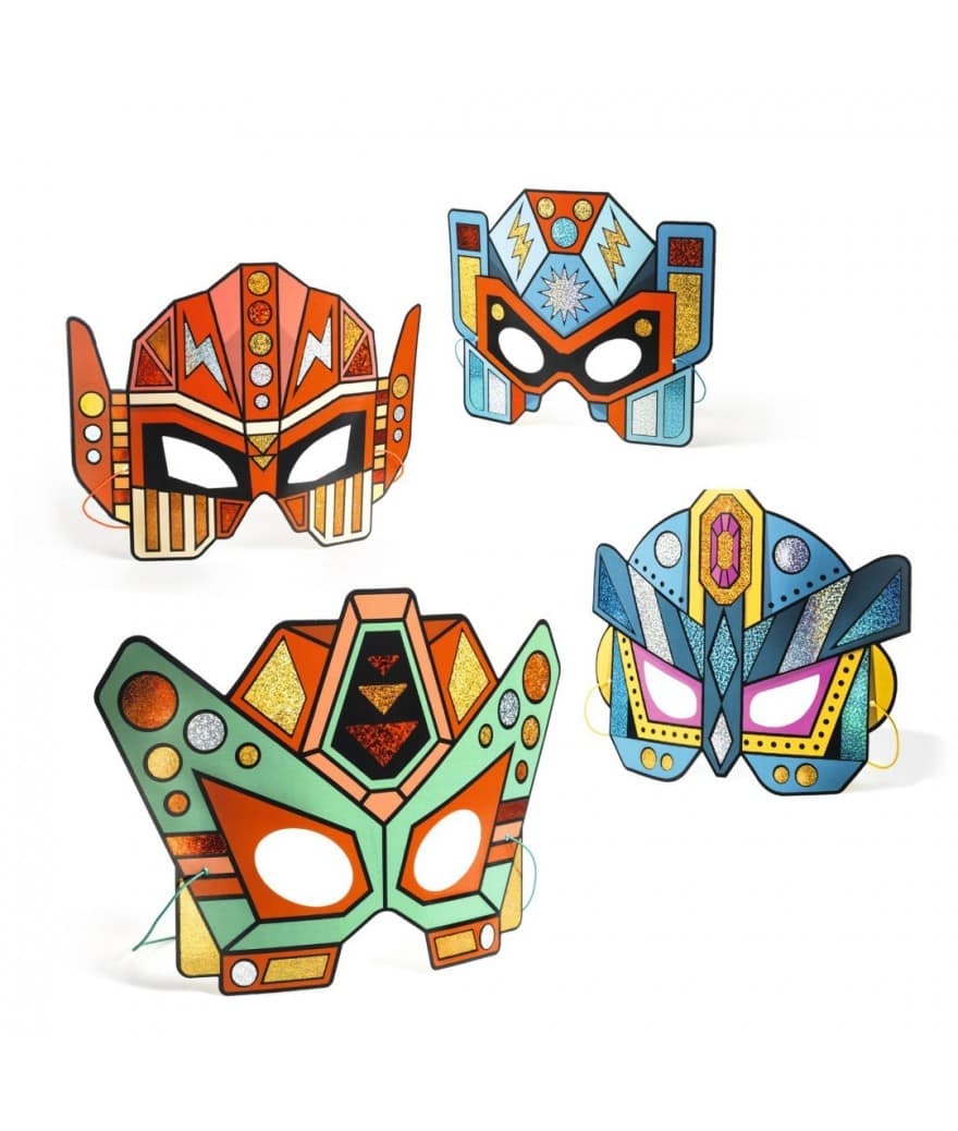 Djeco DIY maskers super robots: Een creatieve set om 4 maskers van Super Robots te maken met metallic glans. Omdat de maskers zelfklevende zones hebben, kan het kind de folie aanbrengen volgens de nummering die aangegeven staat in het stappenplan. Het materiaal wordt als bij toverslag aangebracht op de maskers die een prachtige metallic glans krijgen!