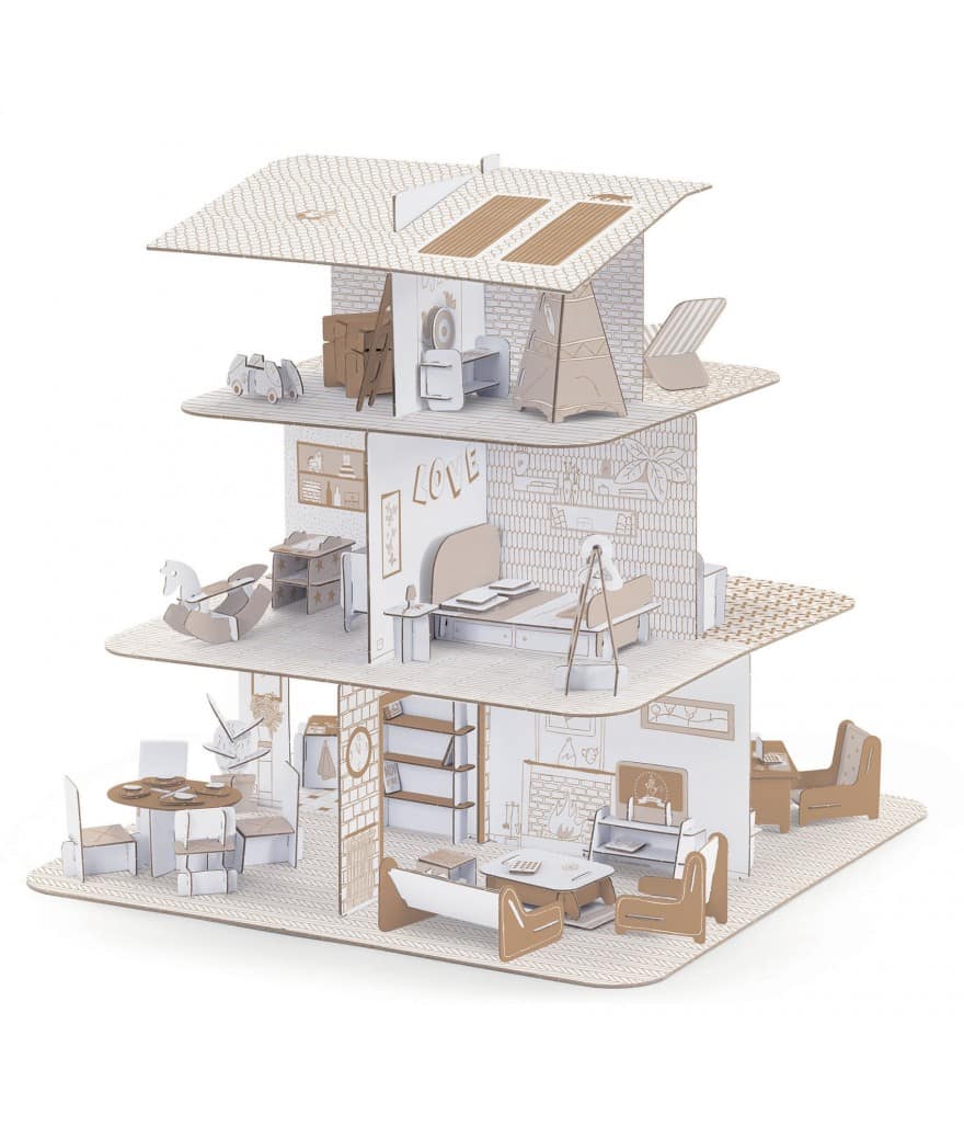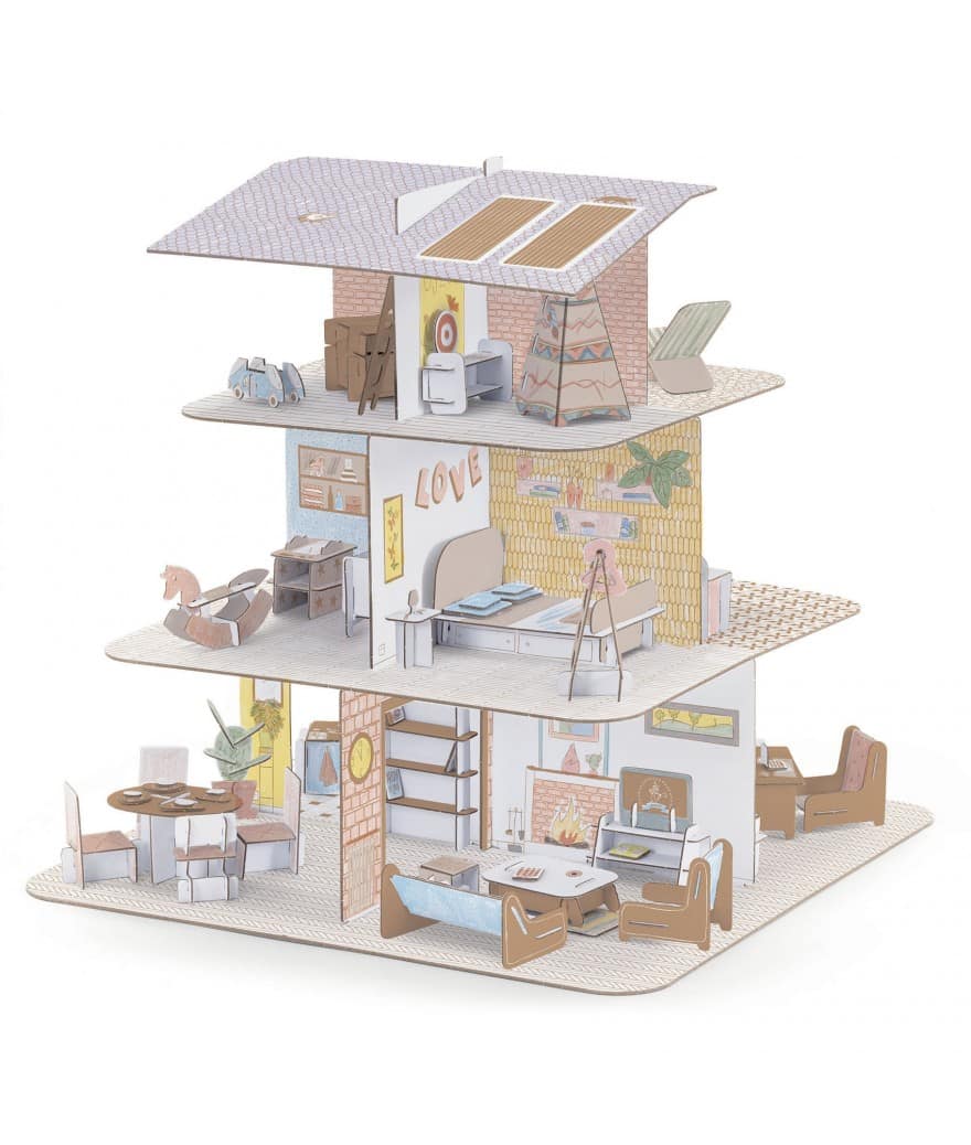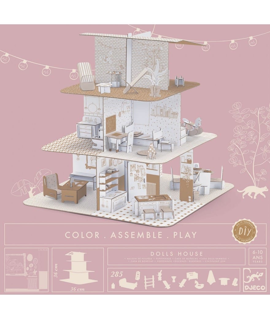 Djeco DIY poppenhuis: Een knutselset waarmee je je eigen droomhuis kunt kleuren en bouwen! Compleet met meubels en accessoires. Het DIY poppenhuis heeft drie etages en bevat meer dan 225 onderdelen (boekjes, planken, decoratie etc.). Heb je nog leuke stofjes, klei en andere knutselmaterialen liggen? Dan kun je dit natuurlijk eindeloos combineren en er je eigen creativiteit op los laten. Perfect voor de interieur designer in spé en uren knutselplezier! Geschikt voor poppetjes van ongeveer 8 cm.