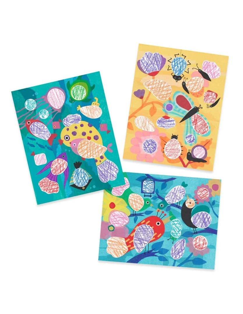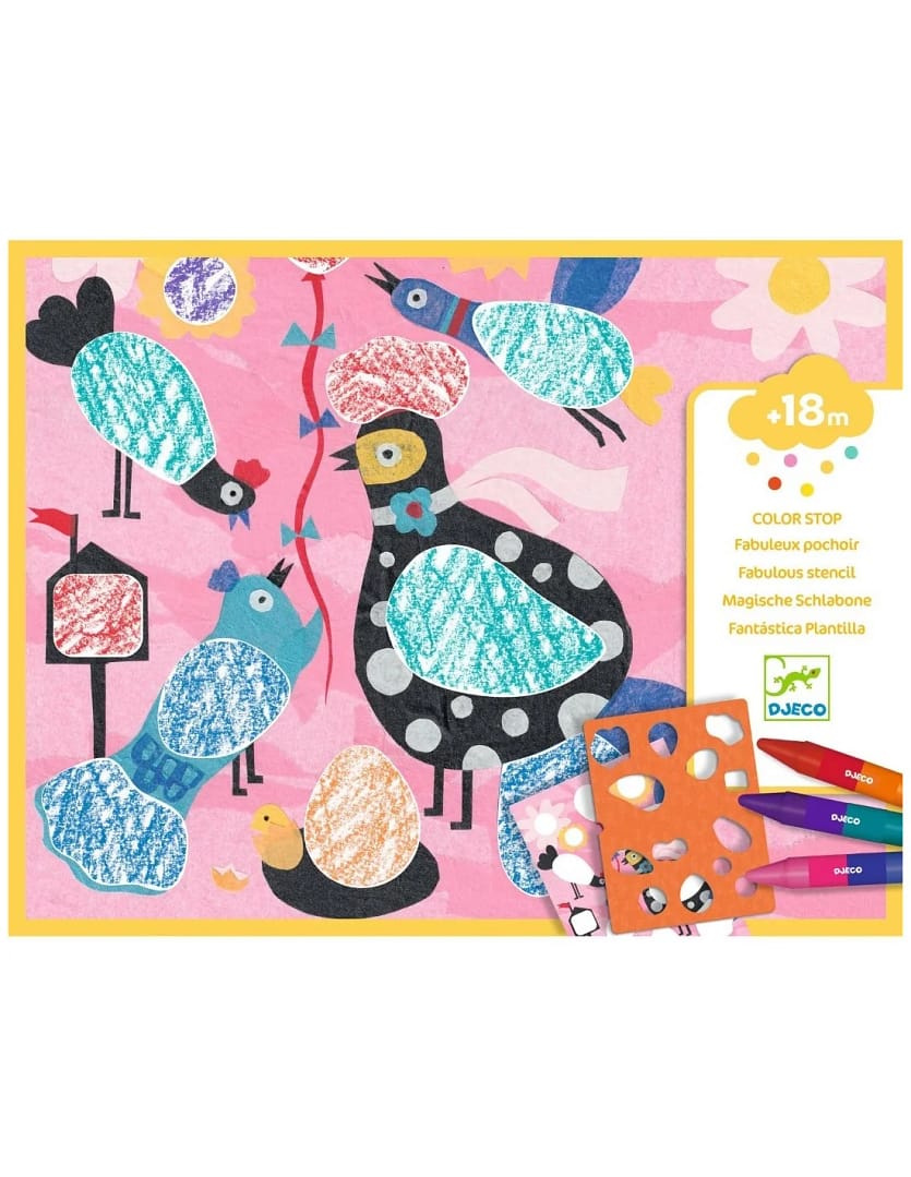 Een ideale kleurdoos voor kinderen vanaf 18 maanden. Met een beetje hulp van een volwassene legt het kind eerst een blad in het deksel van de doos, daarna de sjabloon. Door in de gaatjes te krabbelen, ontdekt het kind prachtige schilderijen – een speelse manier om kleuren en vormen te verkennen!
