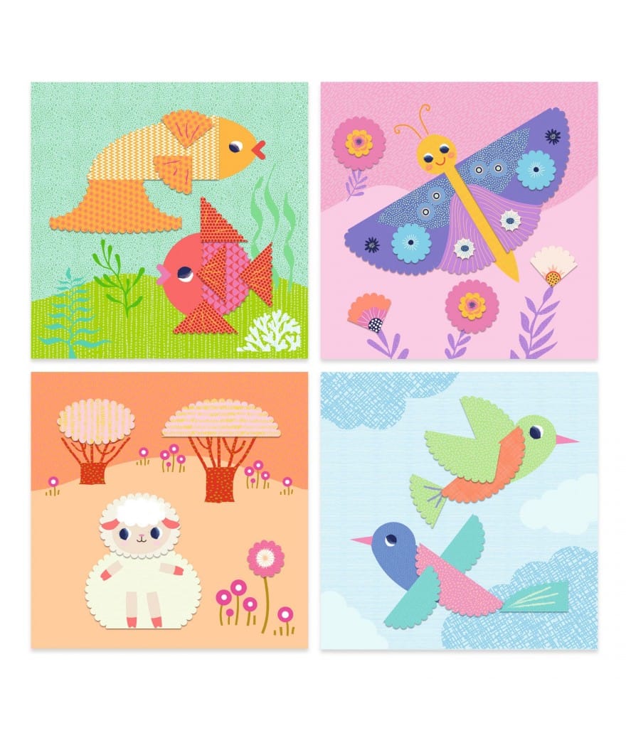 Een Djeco knipset met kartelschaar, een activiteit waar kinderen dol op zijn! Het kind knipt de vellen uit met de kartelschaar door de lijntjes te volgen. Het kind maakt zo prachtige stukjes met gekartelde randen die hij/zij vervolgens op de geïllustreerde kaarten plakt om vier schilderijtjes te maken waar hij/zij erg trots op zal zijn.