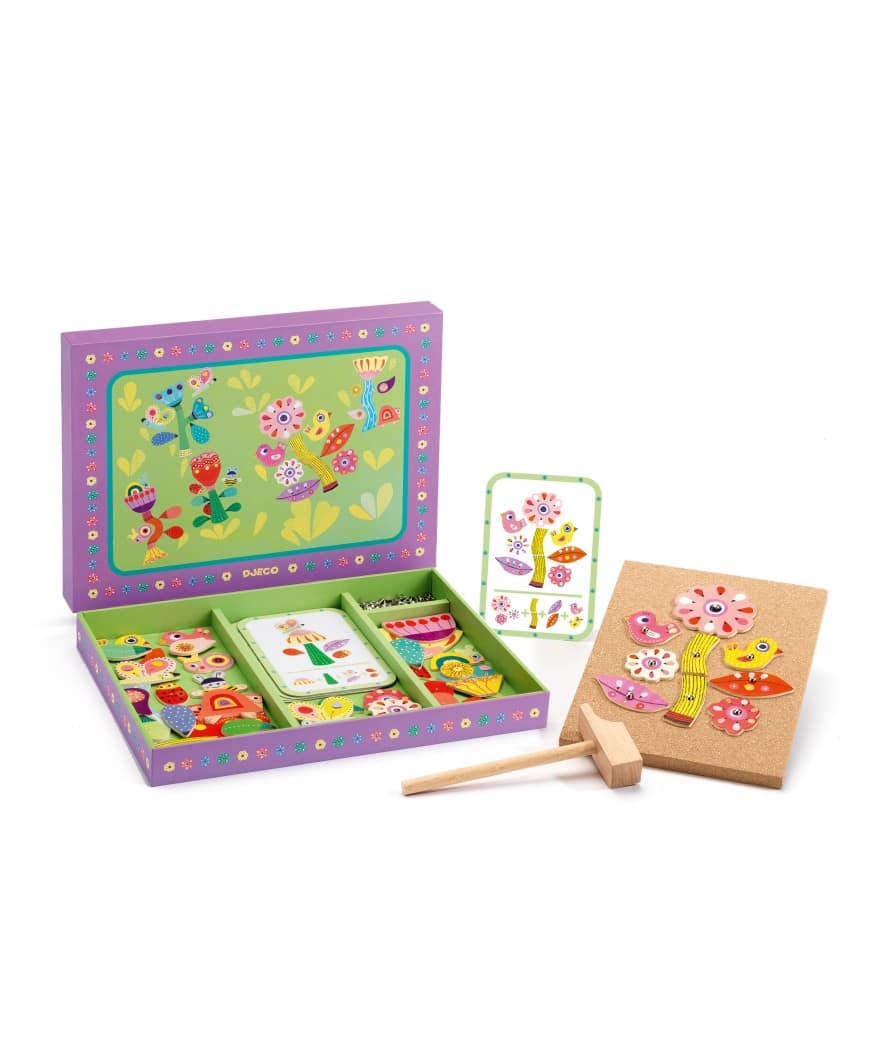 Djeco Tap tap jardin: hamertje tik: een klassieke kleuterschoolactiviteit die door Djeco werd heruitgevonden om de behendigheid van jonge kinderen te ontwikkelen. Je kind bouwt zijn of haar eigen bloemen en tuinen door de stukjes op de basis van kurk te leggen en ze vast te maken met de kleine spijkertjes en de hamer. Hij of zij maakt de modellen na of gebruikt de verbeelding om een mooie tuin te creëren! Dit alles in een mooie houten doos!