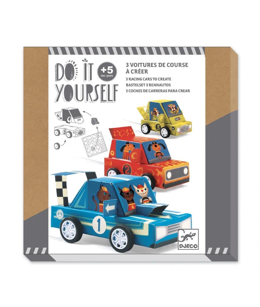 Knutselset DIY – grand prix: Zoef! Maak drie snelle raceauto’s met deze Do It Yourself knutselset ‘Grand Prix’ van het Franse merk Djeco.