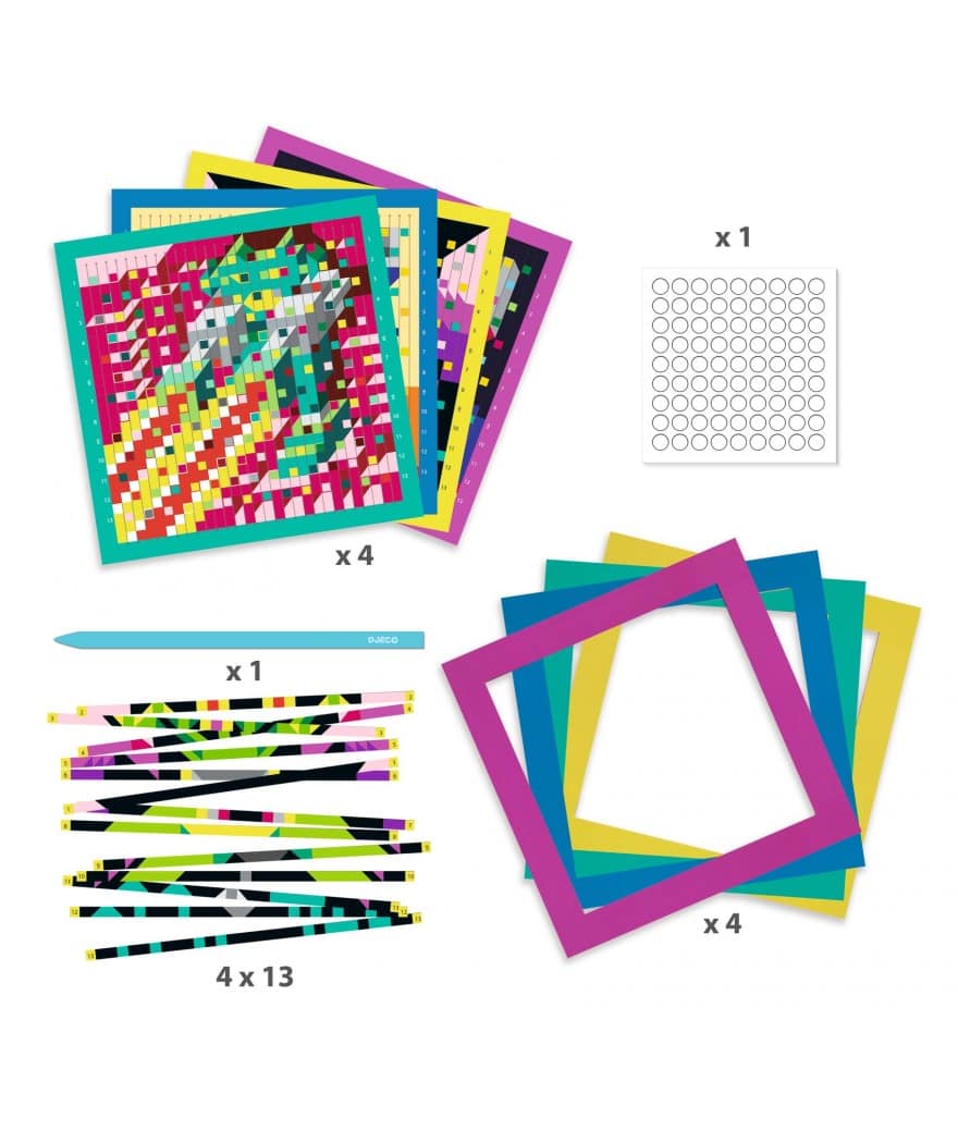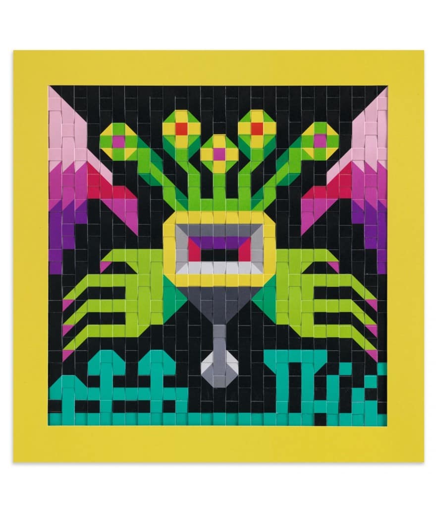 Pixelweven – invaders: Een weefdoos met papieren stroken om 4 “pixel art”-schilderijtjes te maken. Met behulp van het hulpmiddel schuift het kind de papieren stroken in het gedeeltelijk bedrukte en genummerde raster. Stapje voor stapje verschijnen er robots, aliens of UFO’s!