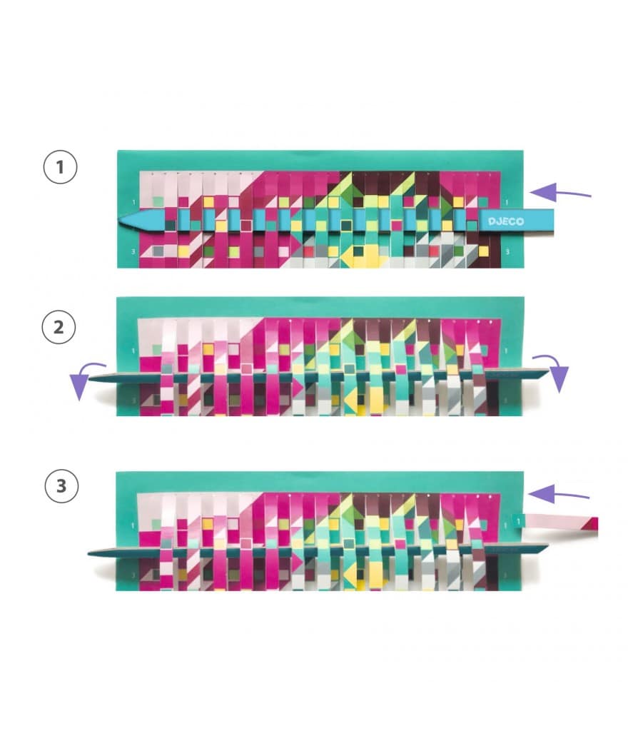 Inhoud: 4 werkraster, 1 set papieren stroken, 4 dikke papieren frames, 1 kartonnen hulpmiddel bij het weven, 1 vel dubbelzijdig plakkend schuim, 1 boekje met stap-voor-stap uitleg in kleur.