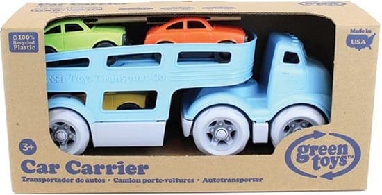 Deze stevige auto-oplegger van Green Toys biedt plaats aan 3 auto’s en heeft een mooi afgerond ontwerp zonder scherpe randen.