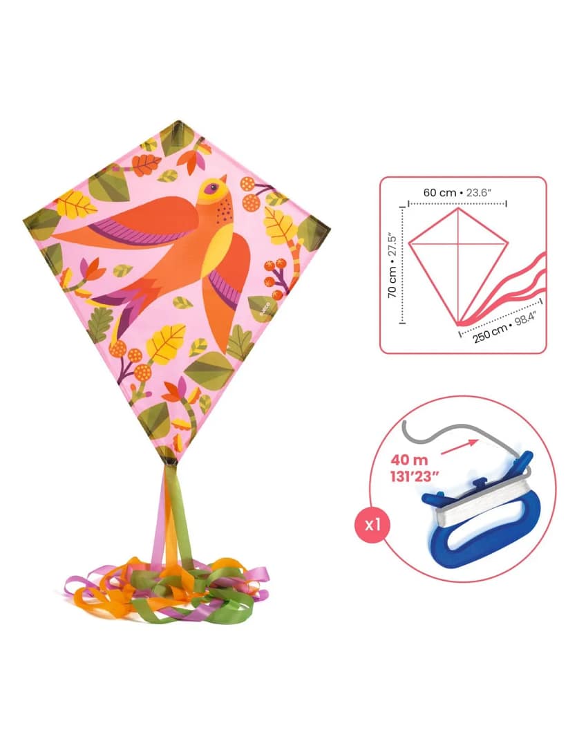 Birdy vlieger van Djeco Birdy is een prachtig geïllustreerde en kleurrijke vlieger voor plezier in de wind. Afmetingen: 60 x 70 cm (+ 250 cm staart).