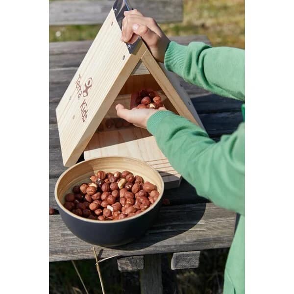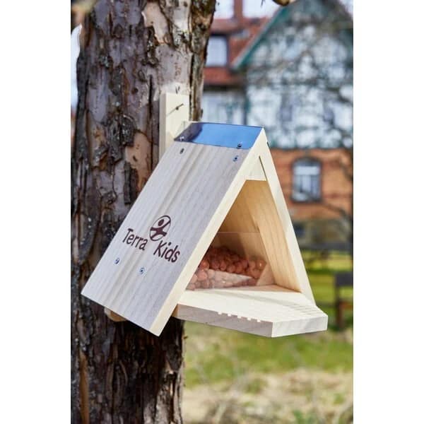 Een mooi bouwpakket om zelf een voederhuisje voor eekhoorns mee in elkaar te zetten, die je op kunt hangen in de tuin