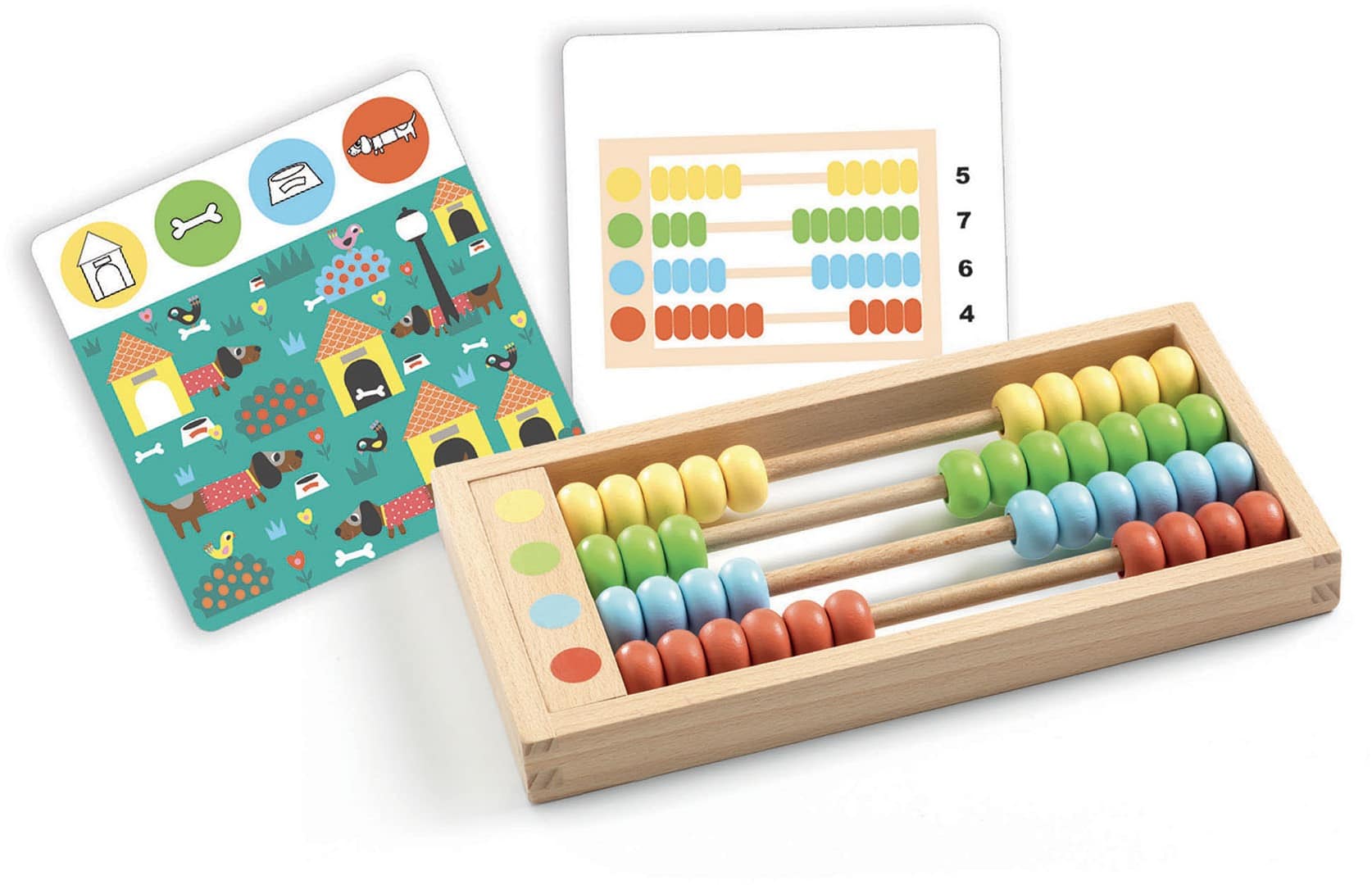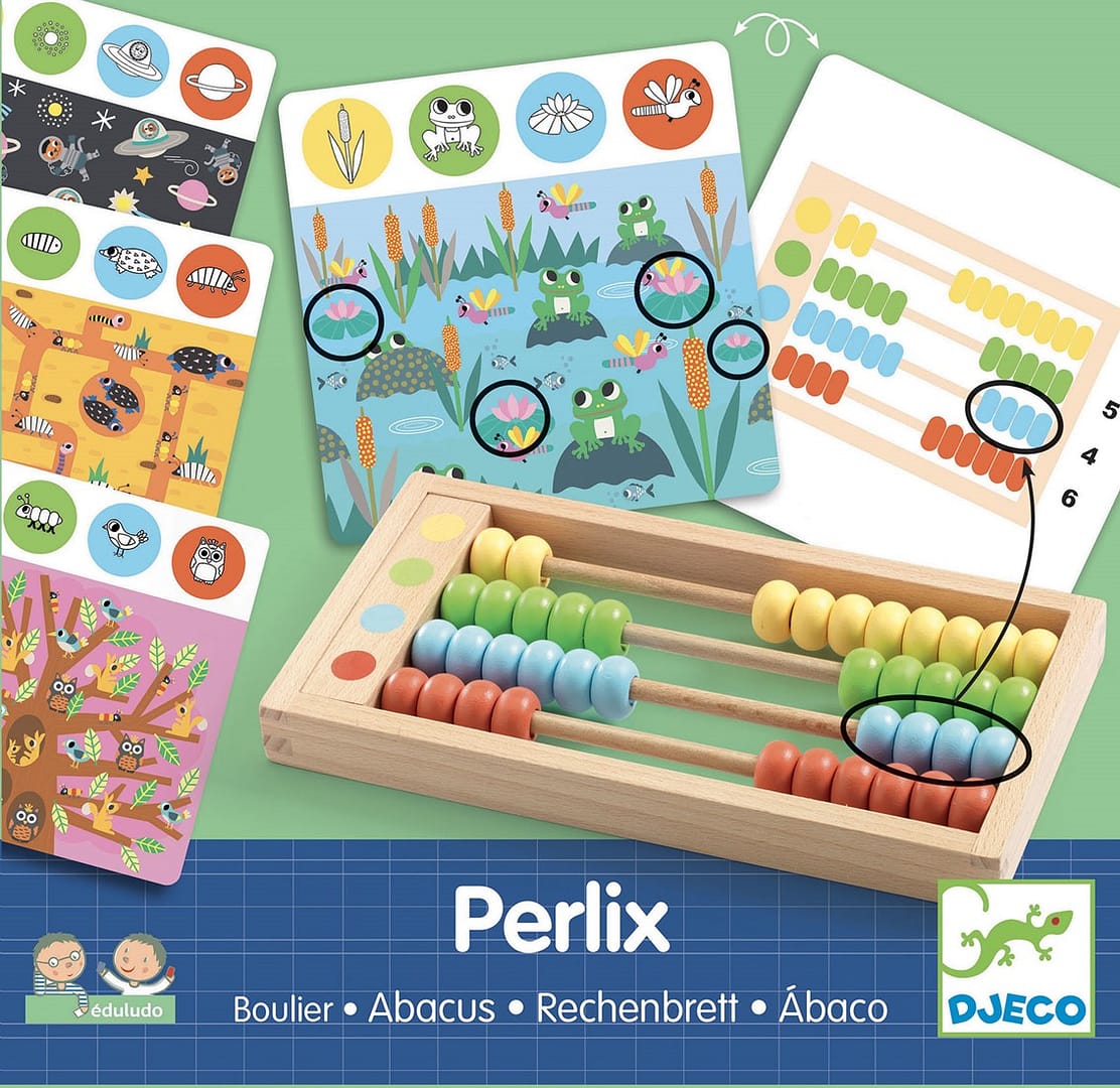 Djeco Perlix telraam : Een eenvoudig en speels leerspel over getallen en hoeveelheden! Op de opdrachtkaart staan de items die het kind moet tellen in het plaatje. Daarna worden ze opgeteld met het houten telraam. Klaar? De oplossing staat op de achterkant van de kaart om zelf te controleren!