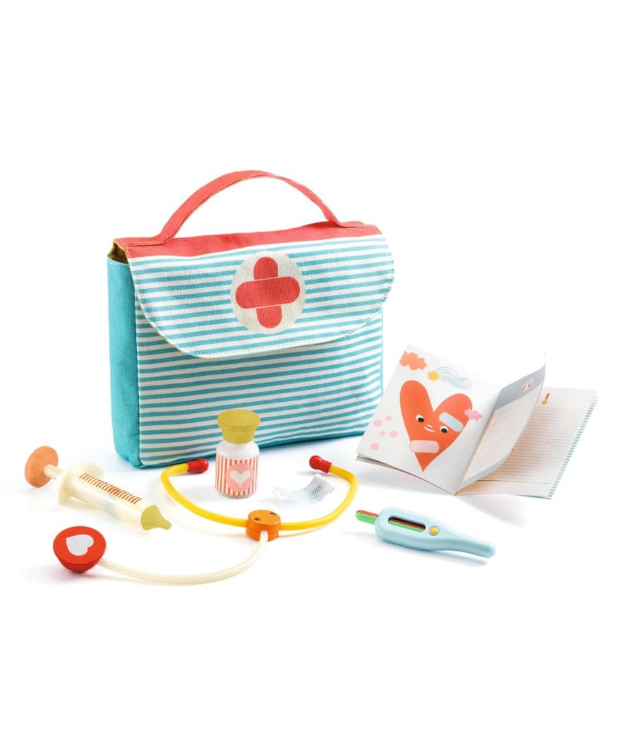 Djeco Pomea dokterskoffertje: Een dokterskoffertje met allerlei accessoires om doktertje te spelen en je pop te behandelen: 1 thermometer, 1 stethoscoop, 1 injectiespuit, 1 medicijnflesje, 1 pleister en 1 gezondheidsboekje.
