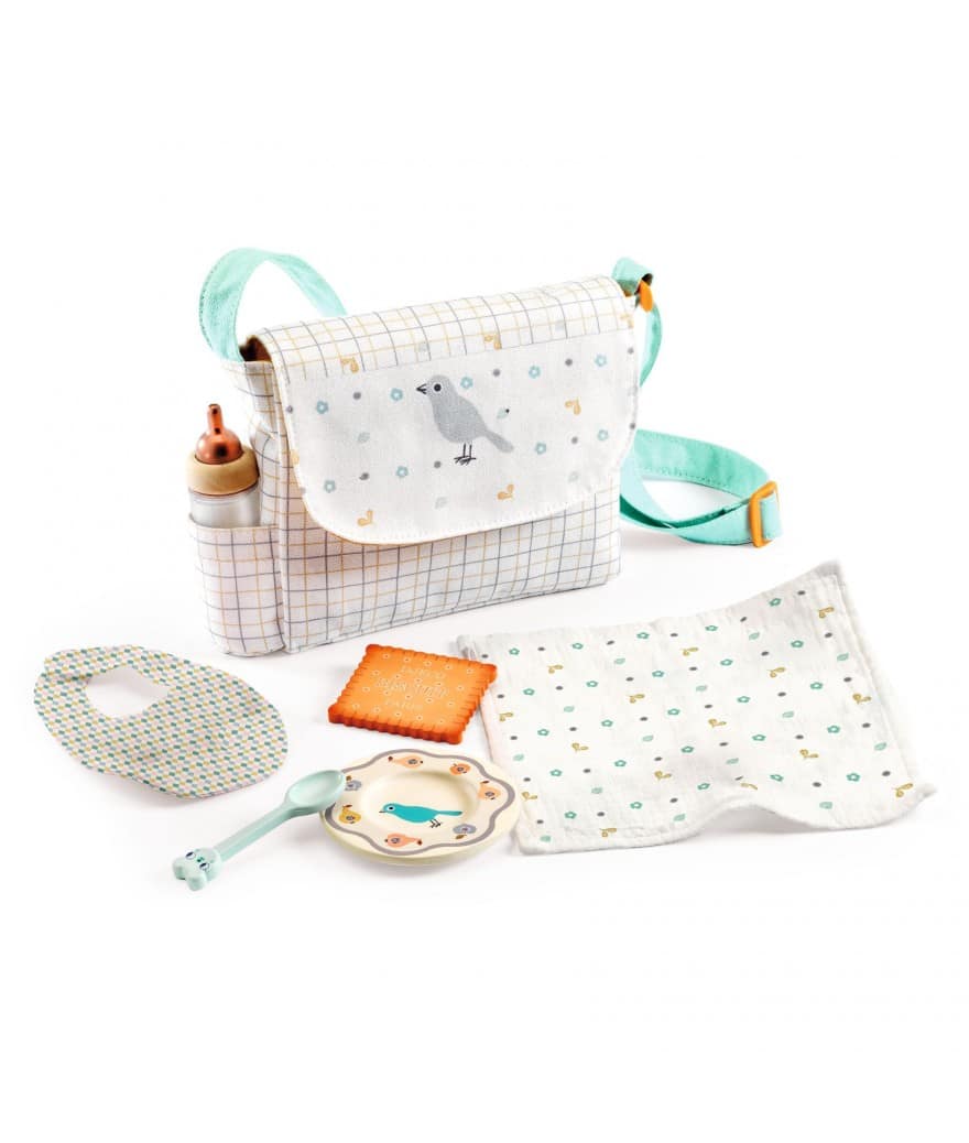 Tijd om te eten! Deze tas van Djeco bevat alles wat je nodig hebt voor een geslaagde maaltijd van je baby: een fles, een koekje, een lepel, een bordje, een slabbetje en een doek voor op je schouder waar je baby een boertje op kan laten… Een mooie tas van dikke stof met een zakje voor de fles aan de zijkant, waarin je alles kunt opbergen zonder iets te vergeten wanneer je een eindje gaat wandelen.