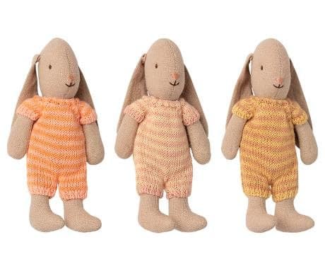 Schattig konijntjes gekleed in een gestreept gebreid pakje van linnen en katoen.