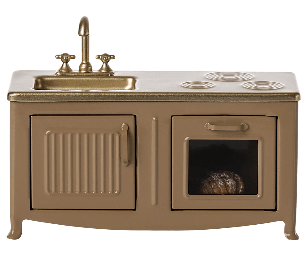 Het hart in elk huis is in de keuken. Deze metalen keuken heeft een prachtige kleur en veel leuke details, zoals een kastdeurtje, wastafel en een oven met versgebakken taart. De maat is perfect voor de muizenfamilie.