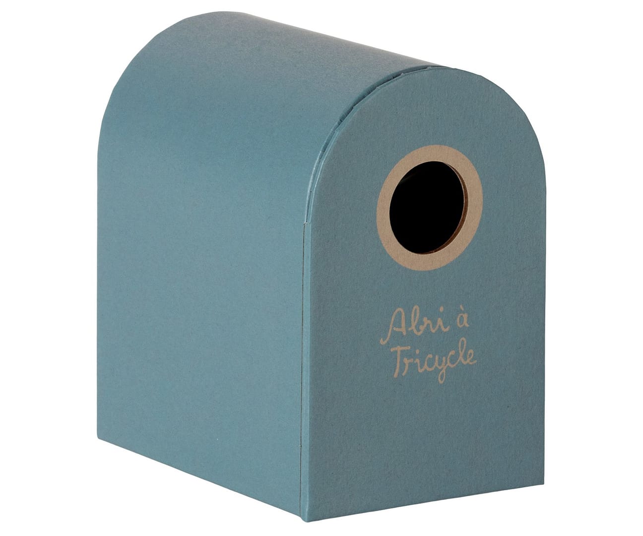 Grote broer en zus maken zich klaar voor een ritje op deze kleine vintage driewieler ‘Abri à tricycle, mouse’ van het Deense merk Maileg.