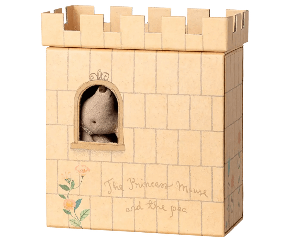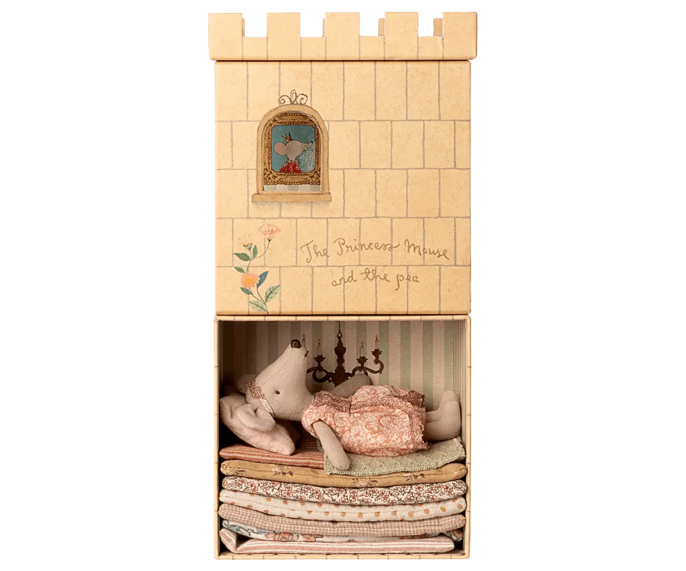 Er was eens…. Deze set is gebaseerd op het bekende sprookje van de prinses op de erwt. De set bestaat uit een kartonnen kasteeltje met 7 matrasjes, een dekentje en een kussen, een erwt en een prinsessenmuis mét kroontje.