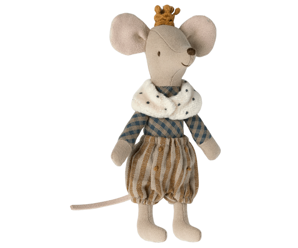 Een echte prins muis. Hij is gekleed in zijn mooiste kleding met mooie details en een gouden kroon. Hij past perfect in het Maileg kasteel.
