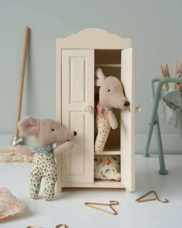 De leuke kast komt met 3 kleine gouden hangertjes zodat de muisjes hun kleren kunnen ophangen. Het is gemaakt van FSC-hout en heeft geen onderhoud nodig.