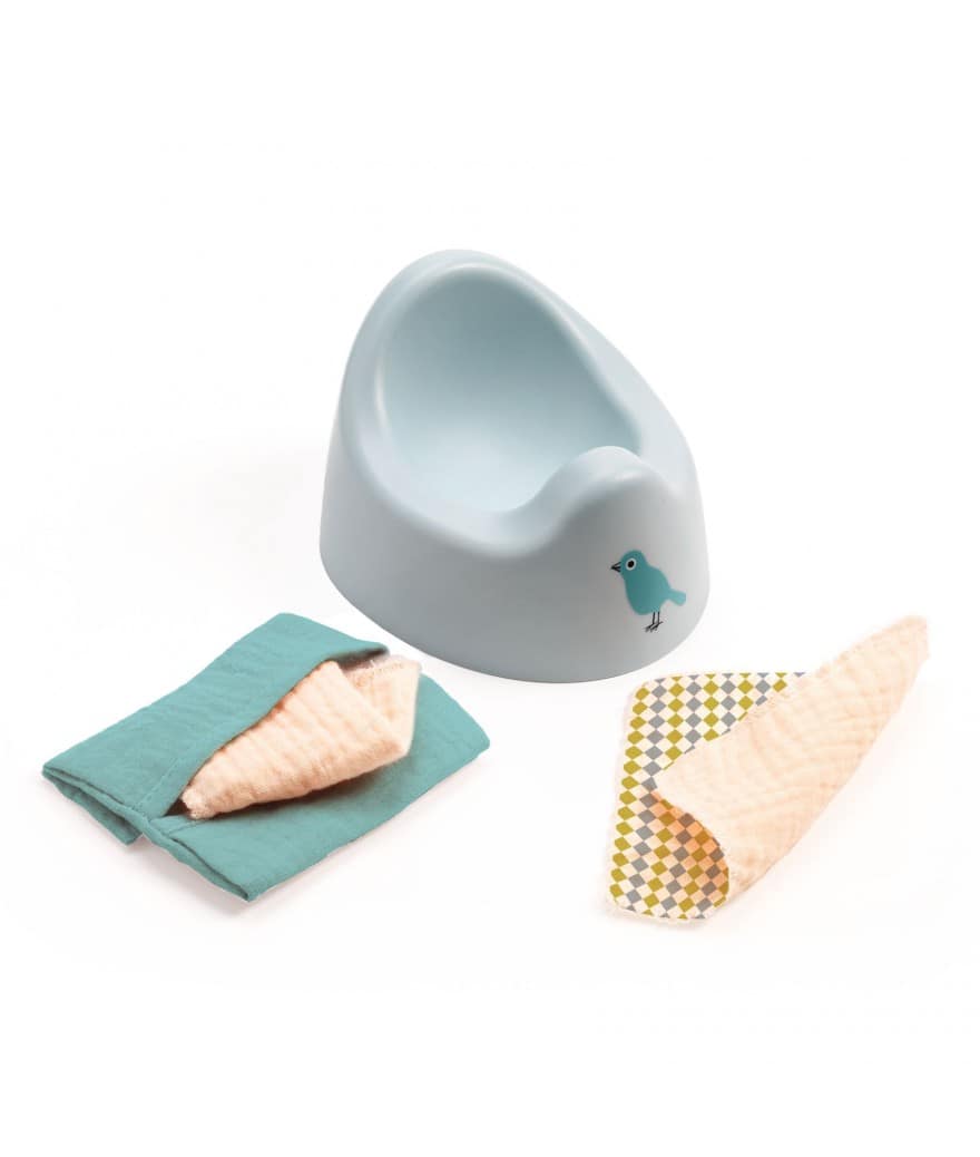 Een potje en een etui met twee zachte doekjes van dubbel gaas: onmisbare accessoires voor je pop om zindelijk te worden!