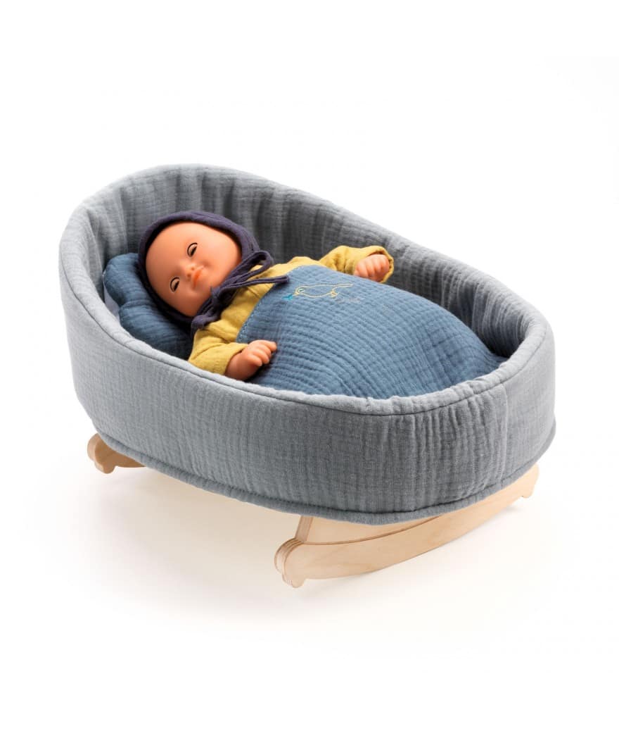 De Djeco Pomea Schommelwieg Blue Dream is bedekt met een gewatteerde blauwe hoes van dubbel gaas van 100% katoen. Met het hoofdkussen en de zachte deken kun je je pop heerlijk wiegen voor een vredige nacht.