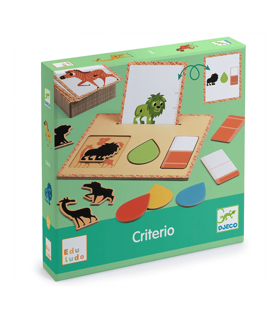 Ontdek het Djeco Criterio sorteerspel! Aan de hand van een dier ontdekt het kind de 3 overeenstemmende criteria: dier, kleur en grootte. Het spel bevat 36 kaarten met vormen, 1 spelbord, 10 fiches in 3 verschillende vormen en 1 boekje. Een leerzaam en leuk spel voor jonge ontdekkers!