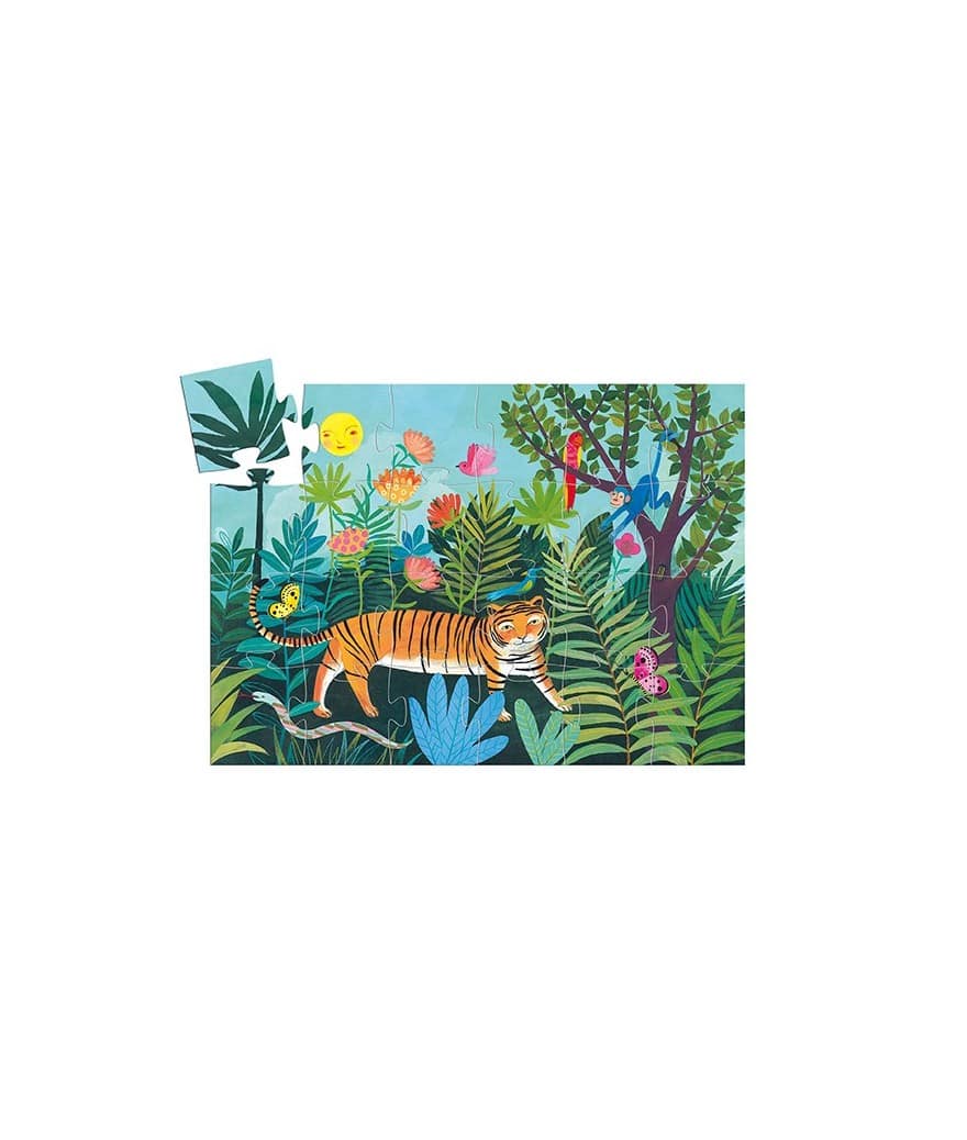 Djeco puzzel – de tocht van de tijger: Een tijger wandelt door de jungle … Een prachtige 24-delige puzzel in een elegante tijgerdoos.