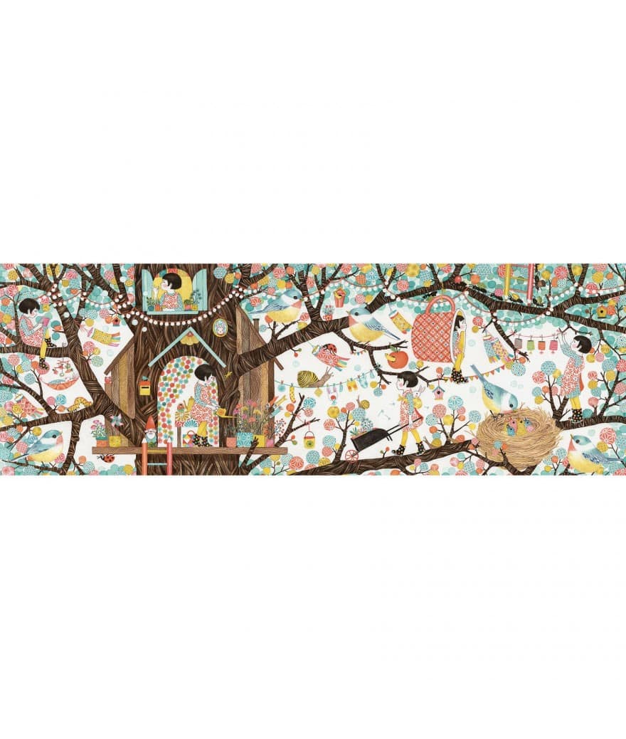 Djeco puzzel, tree house 200 stukjes: Tree house is een 200 delige puzzel gallery. Verborgen in het hart van het bloemrijke bladerdak, is het leven zoet en kleurrijk. We hebben carte blanche aan de illustratoren gegeven voor een nieuw, zeer lang formaat! Een speelse en originele manier om kinderen kennis te laten maken met schilderen.