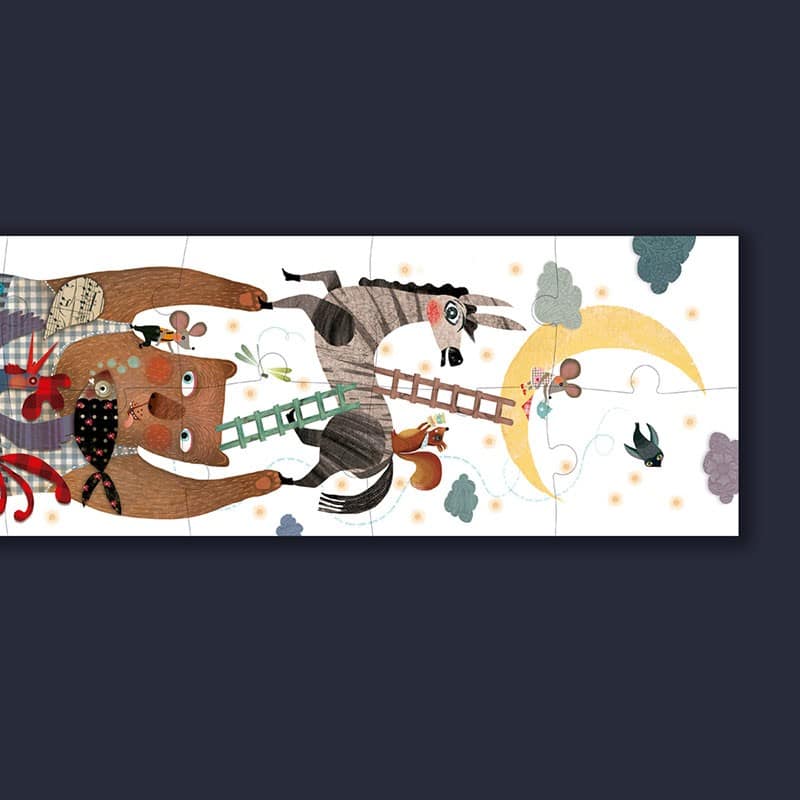 Londji Up to the moon puzzel Een prachtige grote puzzel (24 stukjes) waarin onze vrienden laten zien dat we, door elkaar te helpen, alles kunnen bereiken – zelfs de maan! Afmeting: 16 x 128 cm Vanaf 3 jaar