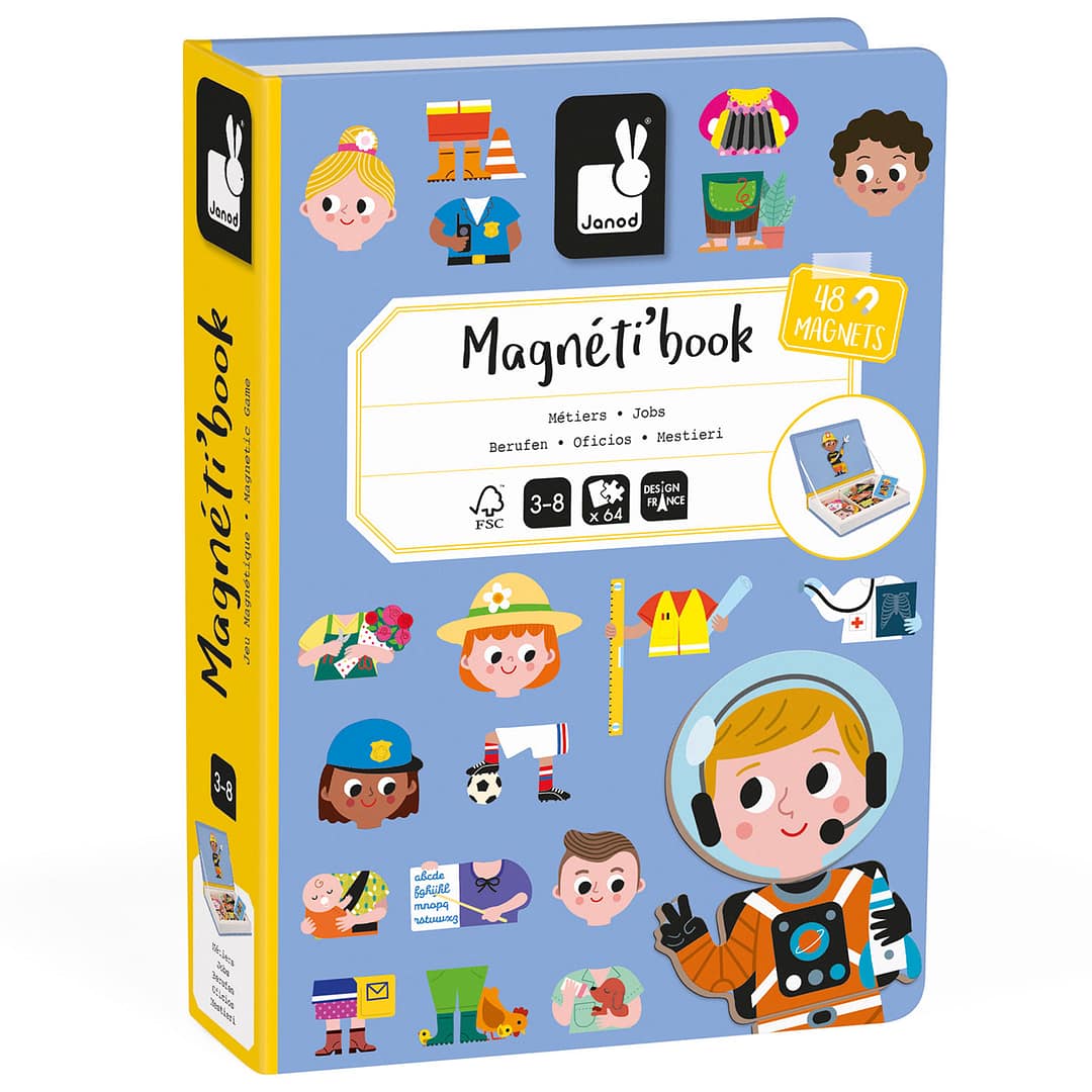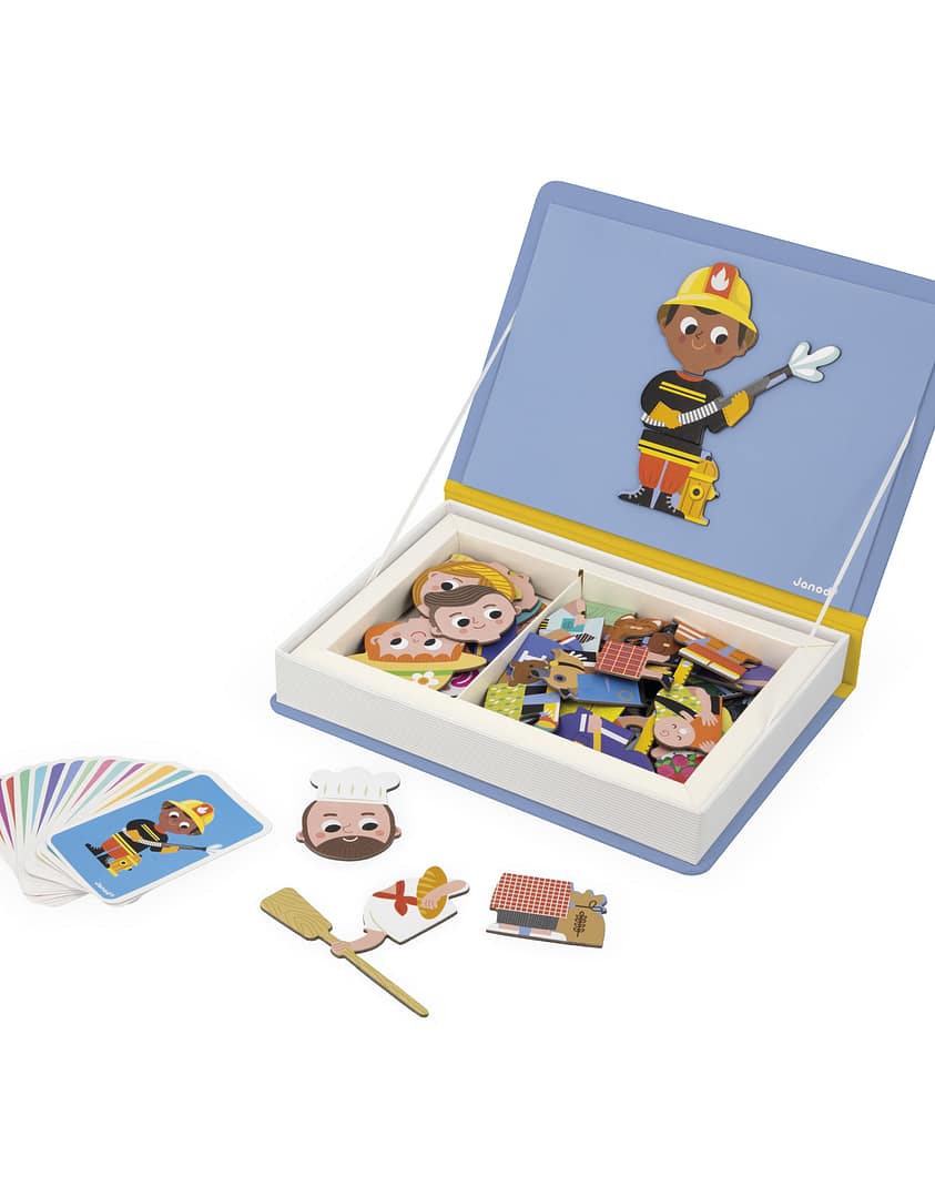 Een origineel koffertje in de vorm van een boek dat makkelijk is op te bergen. Vind alle magneten om de modellen van de voorbeeldkaart na te maken, of laat je fantasie de vrije loop!